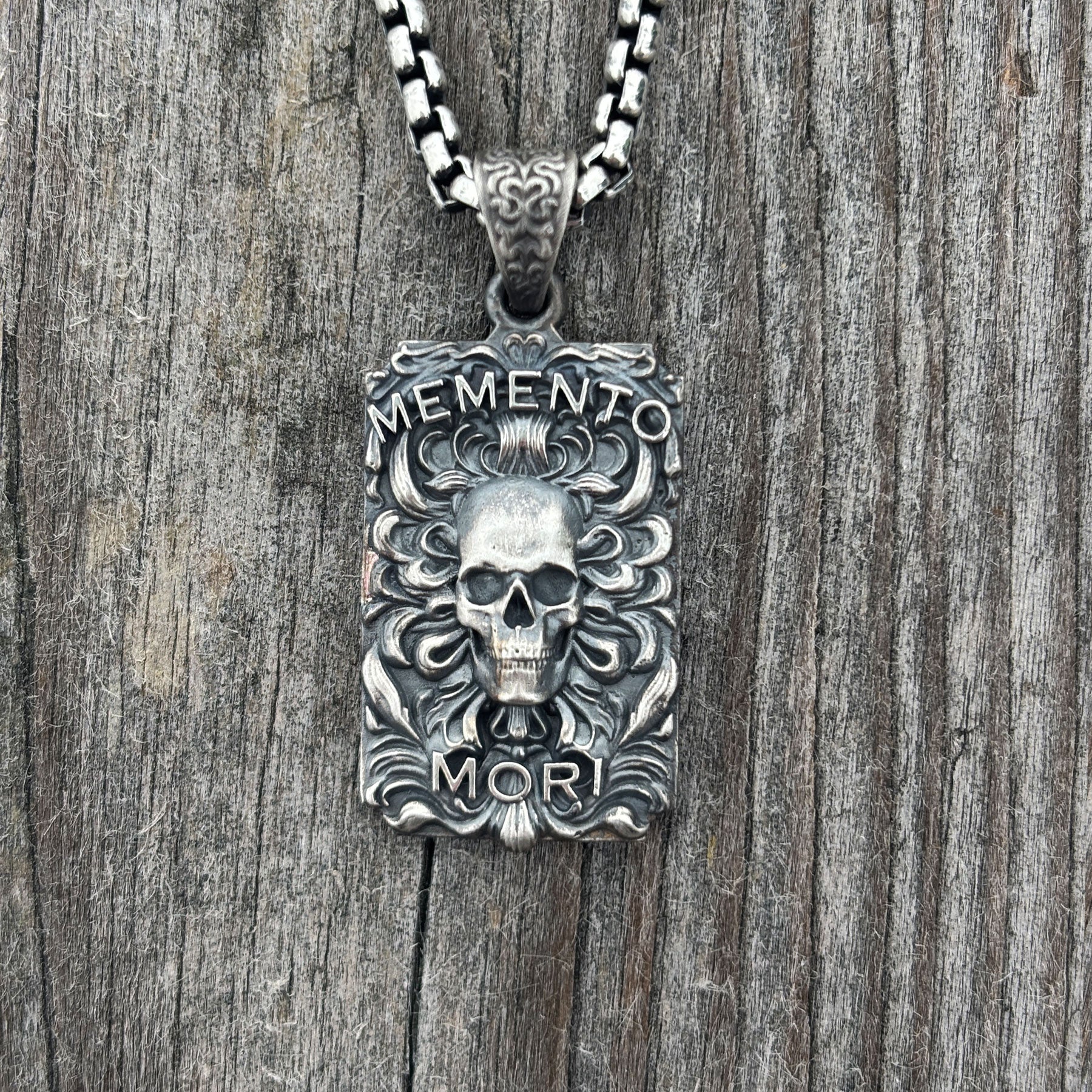 At the center of the pendant, a sculpted skull emerges in defined relief. Unflinching. Honest. A universal symbol that strips away illusion and vanity. Around it, ornamental botanical motifs unfold — intricate, deliberate, alive. They frame mortality with growth, decay with renewal, the finite with the cyclical rhythm of nature.